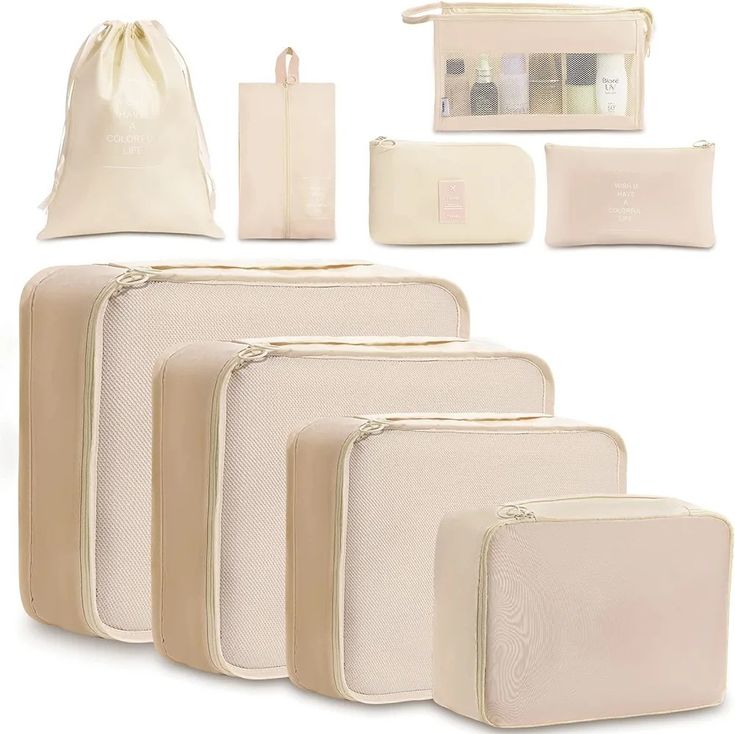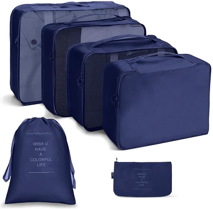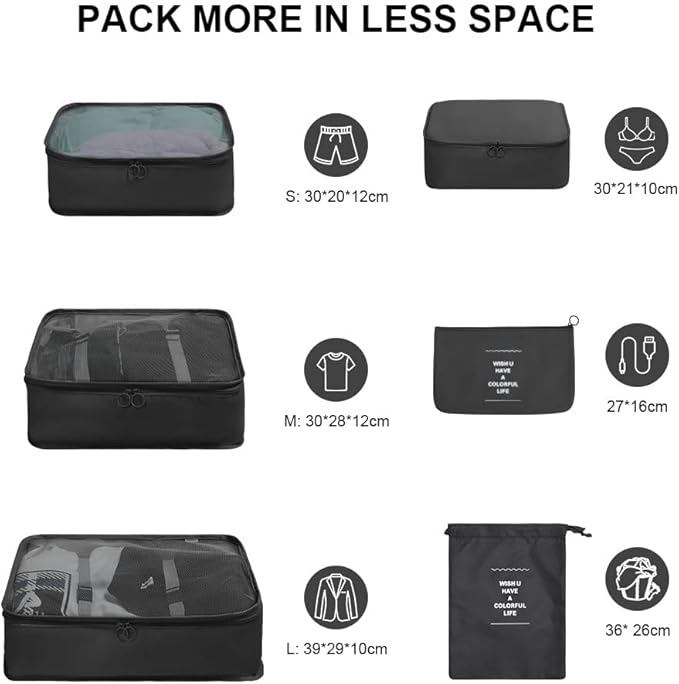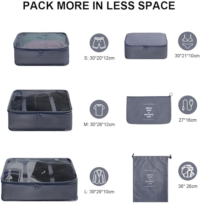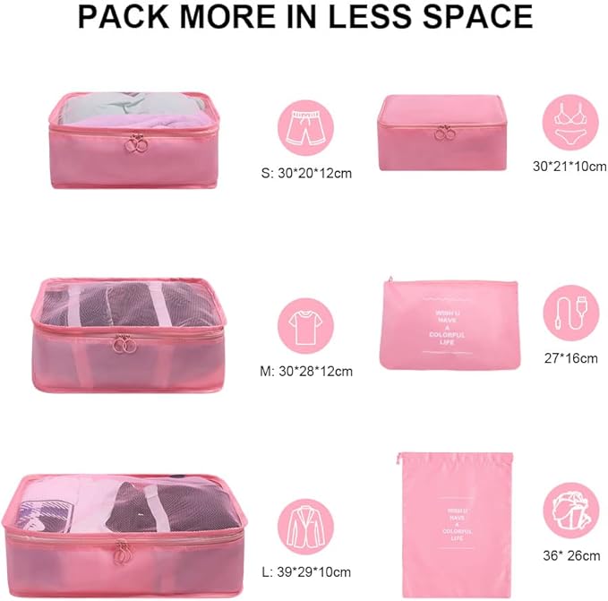 Make packing a breeze with this stylish set of waterproof packing cubes. Perfect for keeping your outfits, lingerie, and accessories neatly organized while saving space in your suitcase.